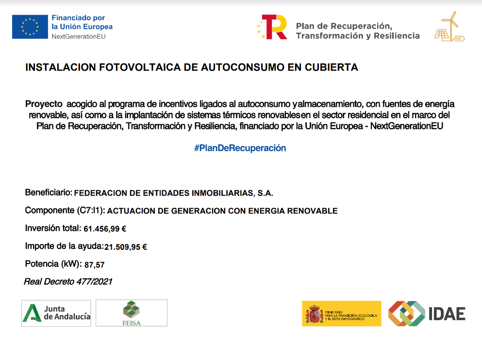 FEDERACION DE ENTIDADES INMOBILIARIAS, S.A., ha recibido una ayuda de la Unión Europea con cargo al Fondo NextGenerationEU, en el marco del Plan de Recuperación, Trasformación y Resiliencia, para la instalación fotovoltaica de autoconsumo de 85,57 kWp dentro del programa de incentivos ligados al autoconsumo y almacenamiento, con fuentes de energía renovable, así como la implantación de sistemas térmicos renovables en el sector residencial del Ministerio para la Transición Ecológica y el Reto Demográfico, gestionado por la Junta de Andalucía, a través de la Agencia Andaluza de la Energía.”